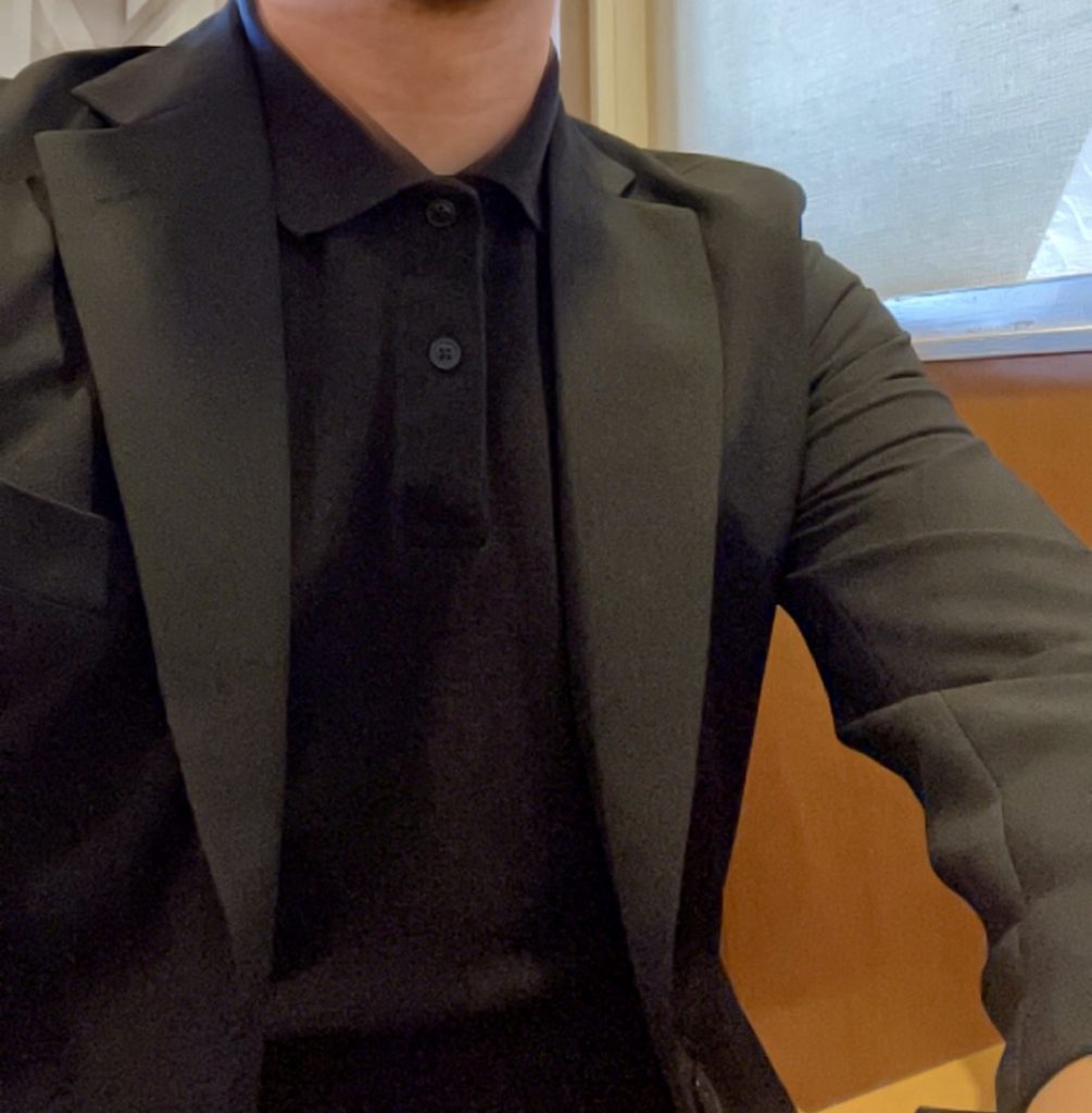 上記の写真は黒のウォッシャブルスーツに黒のポロシャツでシックに合わせましたが、これがオールGUだとは思わないですよね。