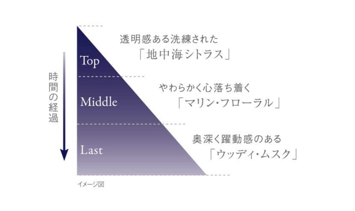 付け始めは爽やかなシトラスから時間が経つと、ほんのわずかにムスクの香りが漂います。