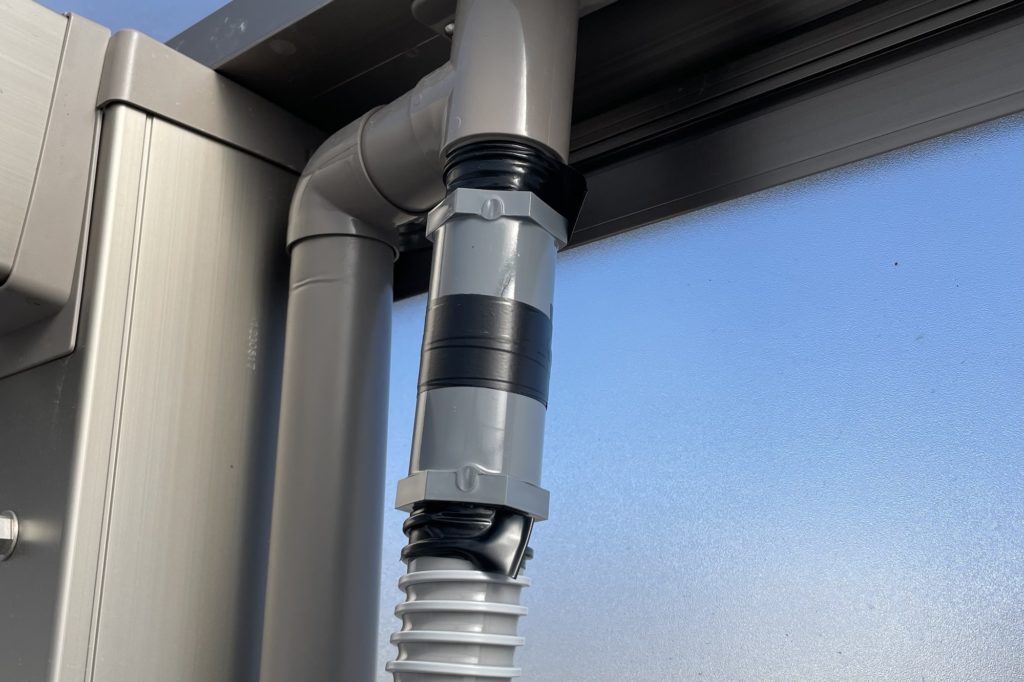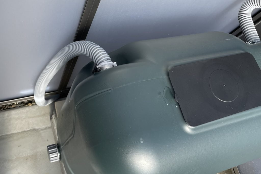 今回紹介したレインジャーニーは、タンクの左右に水の出し入れができる穴が一つずつあるため、給水とは別のもう一方に排水用のパイプを設置しました。